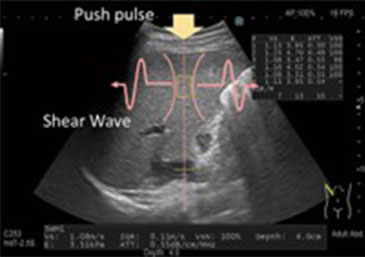 プッシュパルスで肝組織を振動させて発生するshear waveの伝搬速度を計測し肝実質の硬さを定量評価します。また別モードのAttenuation Imagingでは脂肪測定も可能です。